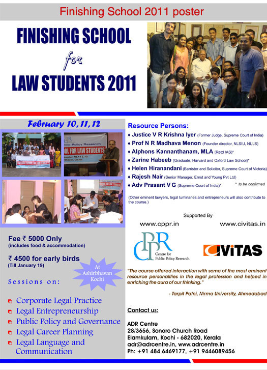Every year, hundreds of law students graduate from colleges and schools in India. But, how many of them are really equipped to become excellent lawyers? Do they have those specific skills that ensure their success? As an attempt to answer these questions, ADR Centre, Kochi, is organising a three-day residential certificate course, Finishing School for Law Students (FSL); one that provides unique insights into legal practice. This course is being conducted in association with the Centre for Public Policy Research (CPPR) and Civitas Legal Solutions, from January, 2012, at Ashir Bhavan, Kochi.